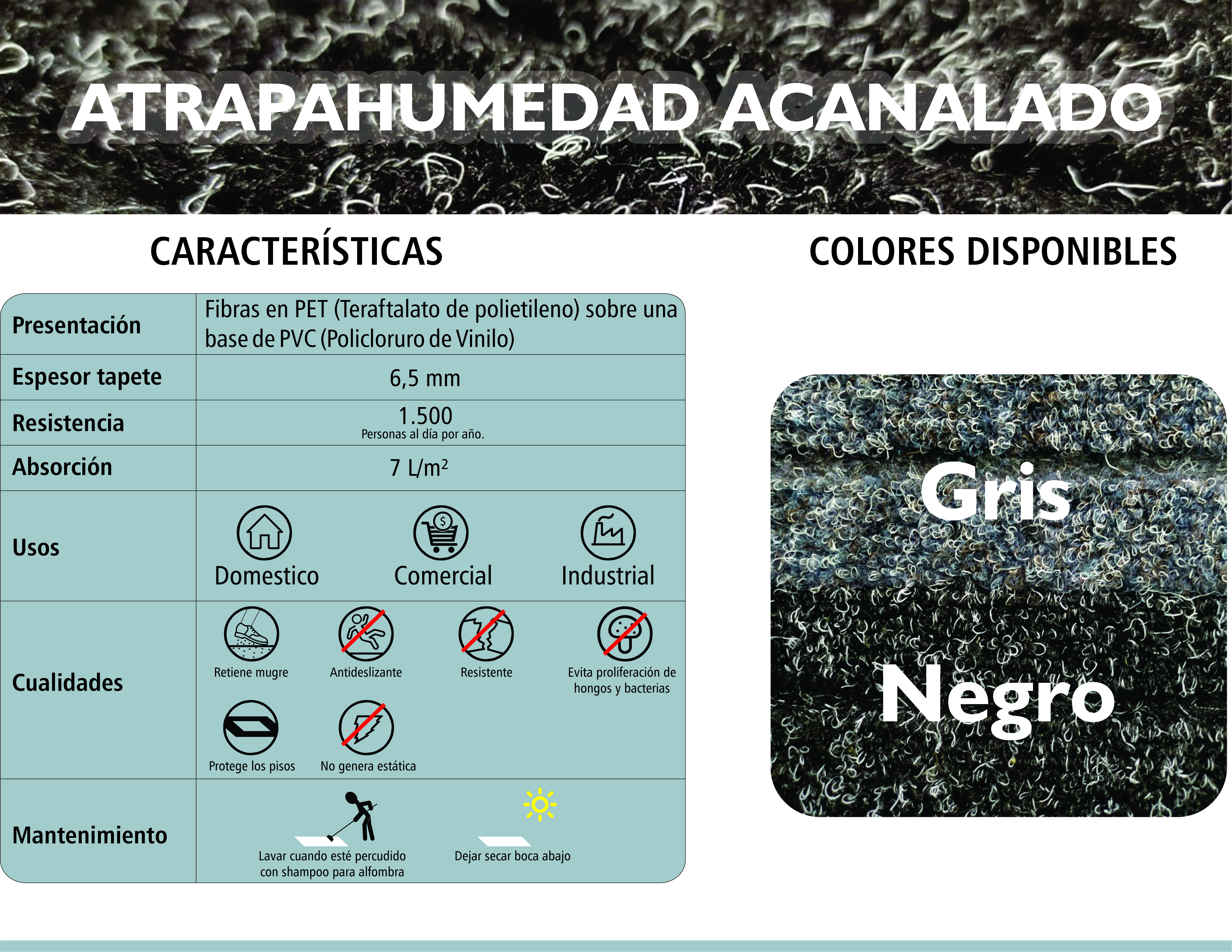 Estructura de canales diseñada especialmente para uso doméstico y comercial, brindando elegancia a interiores. Retiene mugre y humedad, y gracias a su base resistente al deslizamiento, brinda comodidad y seguridad al caminar.