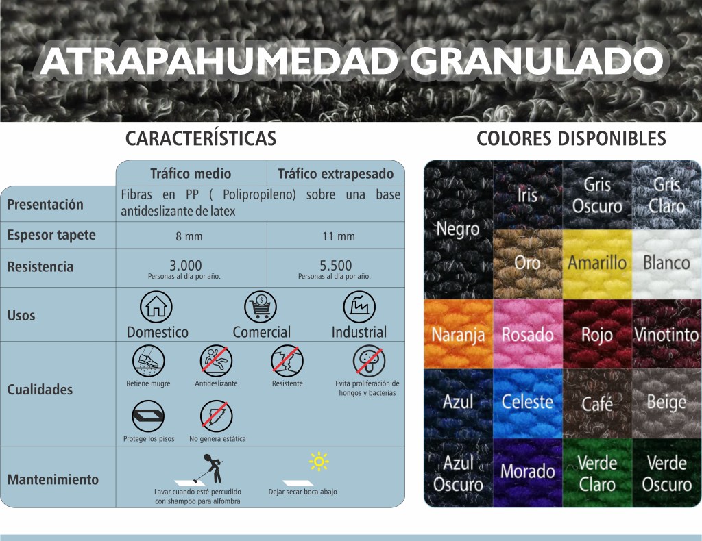 Es un tapete elegante usado en el ámbito institucional, comercial y residencial. Al ser un tapete de alta resistencia es ideal para uso en ingreso e interiores de ascensores, lobbies, auditorios, pasillos, ingresos a casas y apartamentos, entre otros.